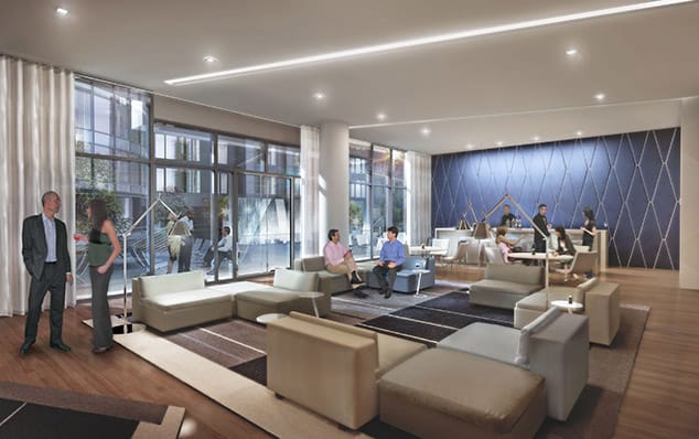 Building amenities include attended lobbies with concierge services, landscaped outdoor courtyard with water feature and seating terraces, 5,000 square foot fitness center, 75-foot indoor lap pool, sauna, club lounge with catering kitchen, business center, and private screening room.